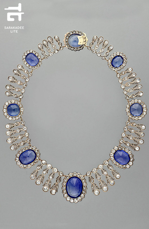 อีกหนึ่งสมบัติล้ำค่าที่ถูกโจรกรรมไปคือ สร้อยคอไพลินศรีลังกา ประกอบด้วยไพลิน 8 เม็ดในขนาดต่างกันๆ และเพชรจำนวน 631 เม็ด  แต่ละข้อของสร้อยคอทั้งหมดถูกออกแบบมาให้เชื่อมกันอย่างประณีต สะท้อนให้เห็นถึงเทคนิคที่ยอดเยี่ยมของช่างฝีมือที่รังสรรค์  ส่วนประวัติและความเป็นมาของสร้อยเส้นนี้เหมือนกับมงกุฎข้างต้นที่ยังคงเป็นปริศนา เพราะมาจากคอลเลกชันเดียวกัน